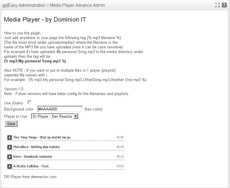 This is a flexible media player plugin that is meant to allow the insertion of a media player (video or mp3) anywhere in the page contents as you create it, no special pages or extra sections are required. Note currently only supports mp3 files.